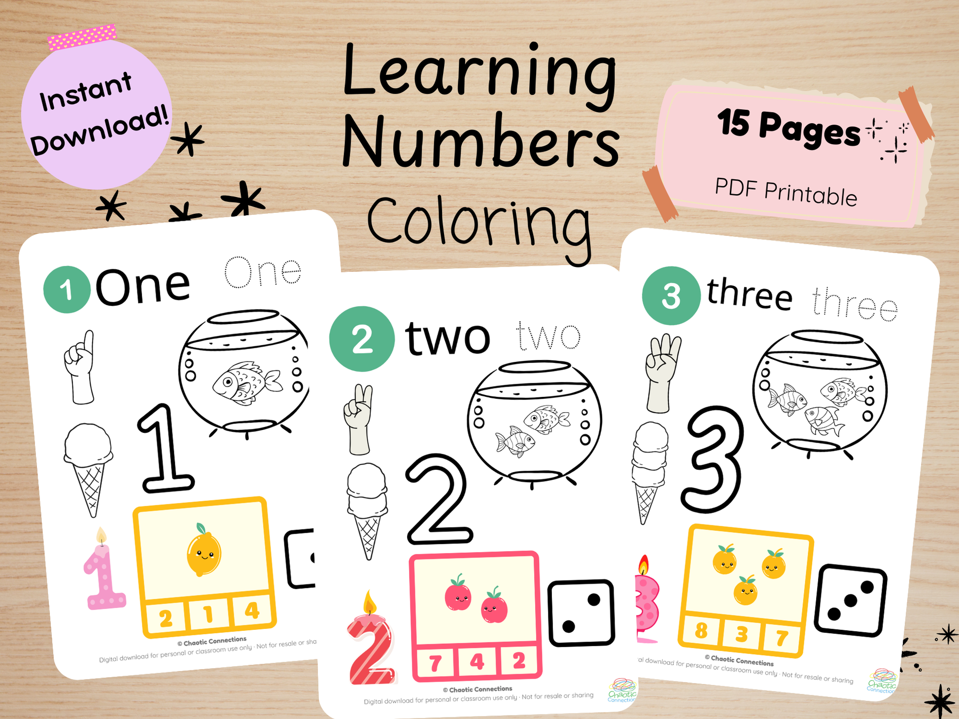 - One coloring page per number, 1–10